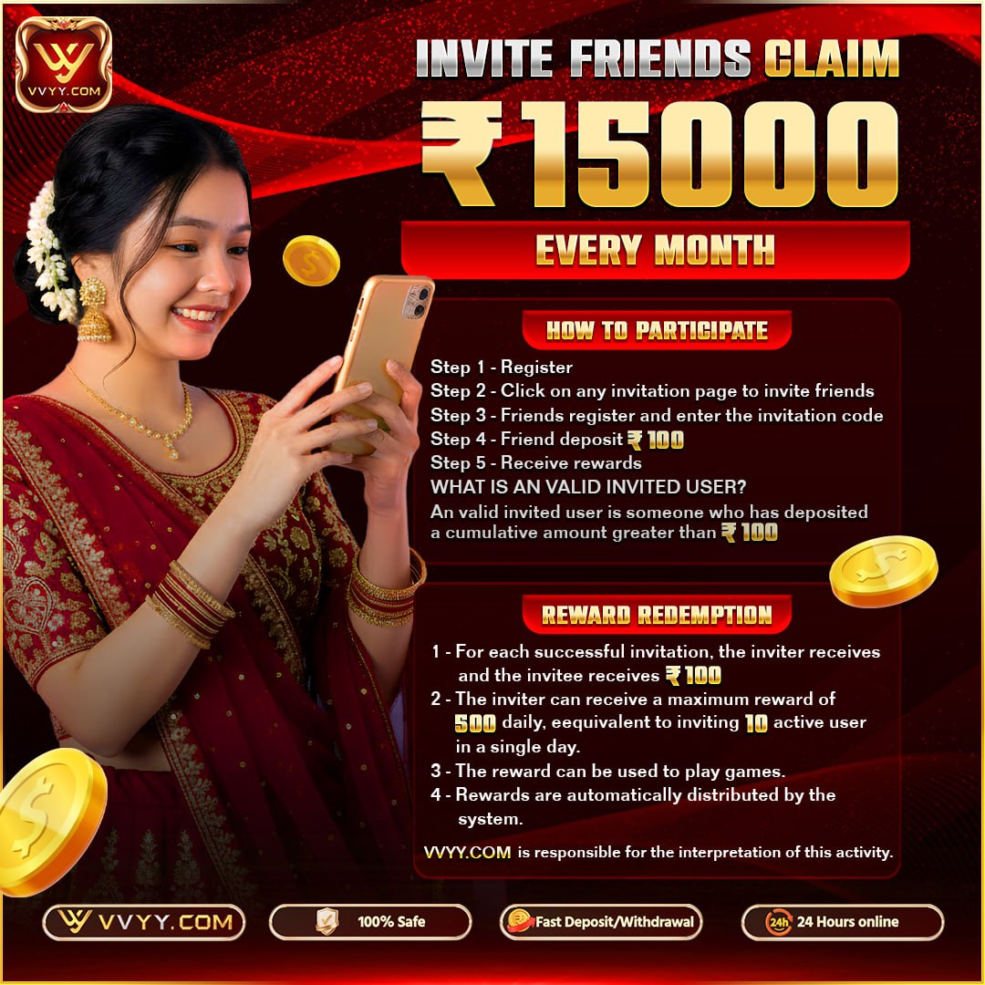 Log in every day for bonuses, cashback, and referral rewards.welcome bonus,first deposit, VVYY Game offers extra bonus credits and more bonus.